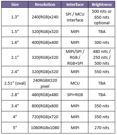 The range starts at 1.28 inch (active area = 32.40 x 32.40 mm), going up to an amazing 5″ but including 2.1″ and 3.4″ also. With various resolutions including 240 x 240, 260 x 360, 1080 x 1080, and an amazing 1920 x 1920 the options are extremely wide! If brightness is critical the range has a wide selection of backlight luminance including 600cd up to 1600cd for outdoor / high ambient conditions