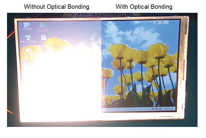 This method is adequate for most applications due to its low cost and simplicity, but this void can be problematic for solutions which are used outdoors or in high ambient light. In these environments internal light reflections within the void often make a transmissive TFT LCD unreadable due to loss of contrast caused by these internal reflections. By filling this void with an optically clear compound, these reflections are reduced, and readability massively increases. Used in conjunction with a high bright display this offers the optimum outdoor solution.