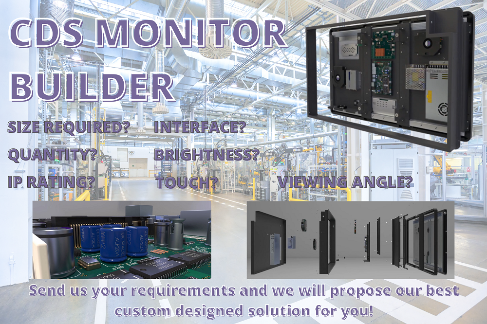 Here at CDS, we are a one-stop-shop for everything bespoke and custom! We have a “monitor builder” webpage where you can design your very own industrial bespoke monitors. Simply answer a few questions and we can propose to you the best possible solution. If there isn’t one readily available on the market, then we will work on a custom design that is bespoke to you.